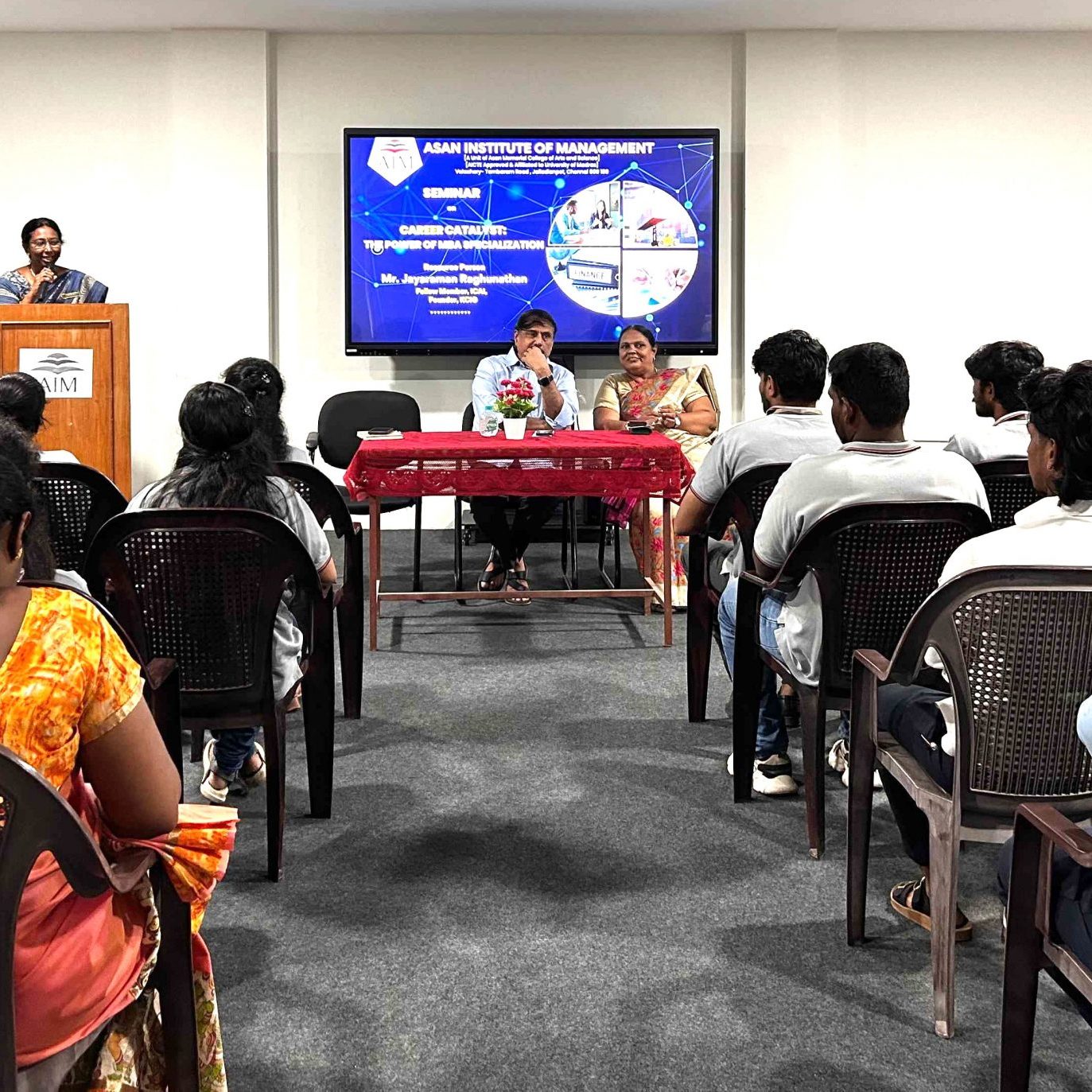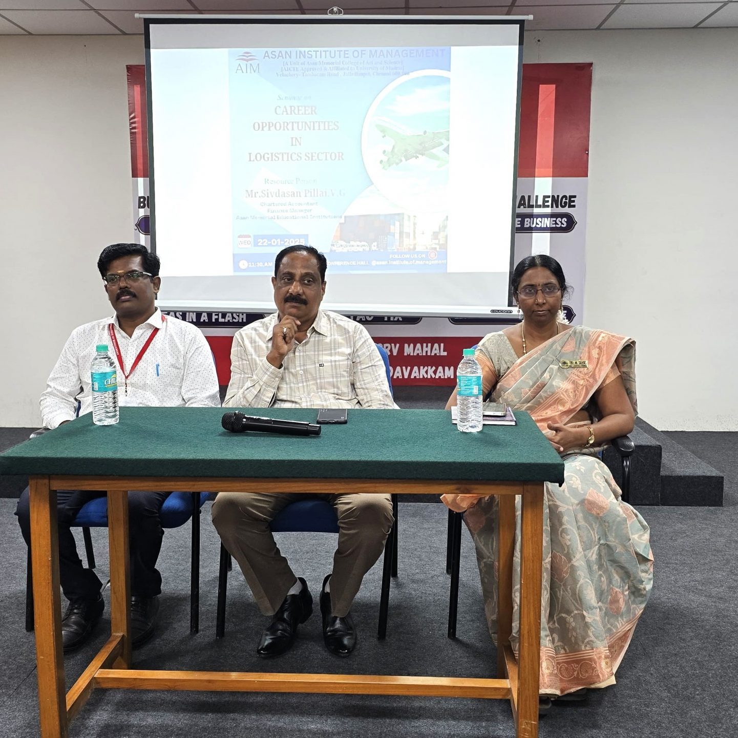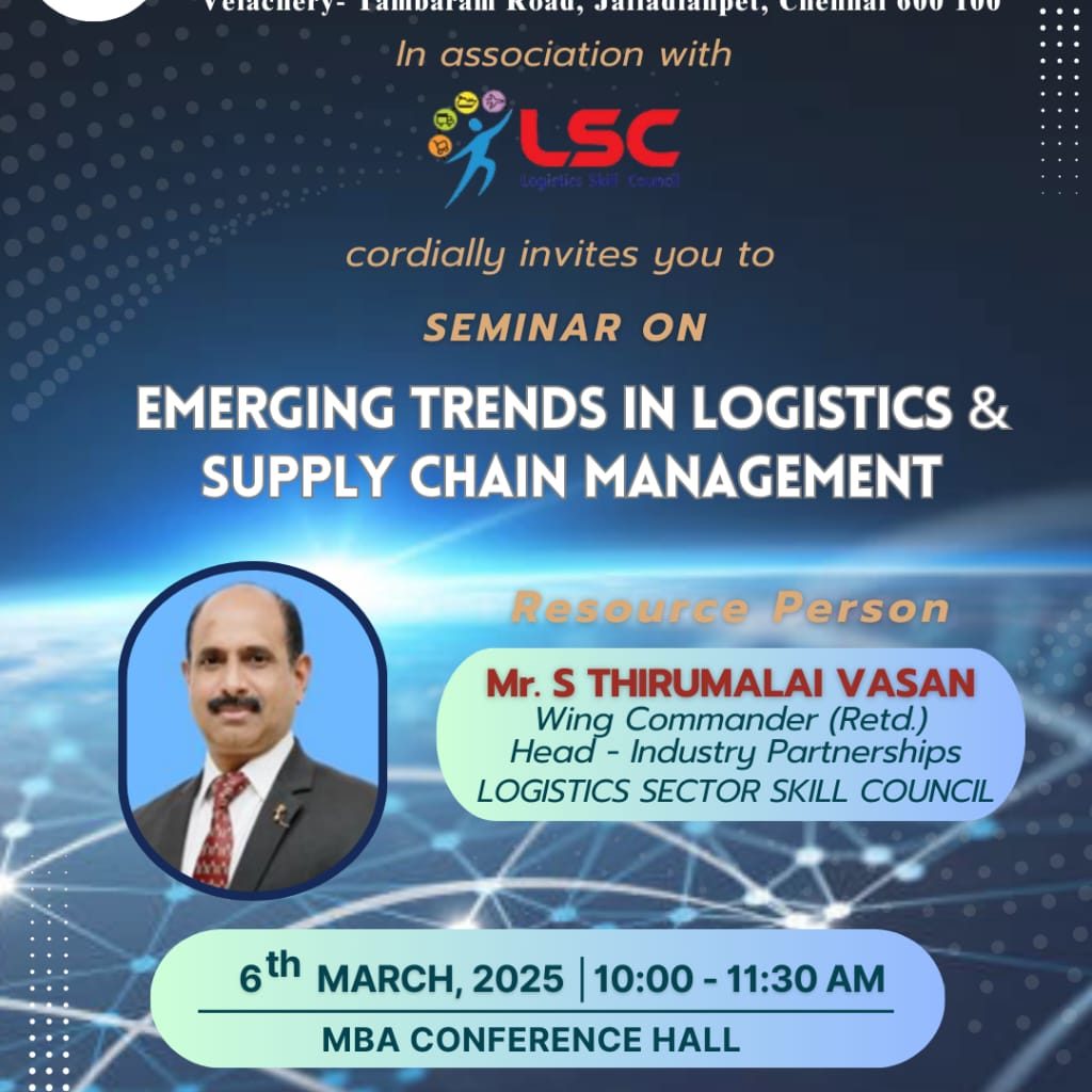 - To shed light on the Career prospects in Logistics, a One day Seminar was organized for MBA students on “Career opportunities in Logistics and Shipping industry,” on Jan 21, 2023.CEO of Galaxy International Institute of Logistics, Chennai, addressed the students.