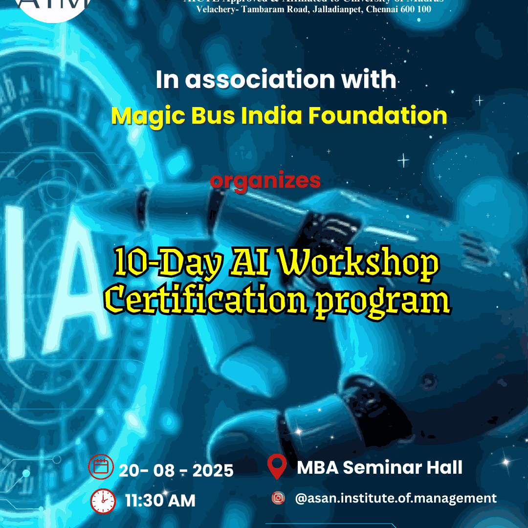 - Ten days Certification Course on “Advanced Business Analytics” jointly organized by Asan Institute of Management & Brainswig Edutech PVT LTD., from 7th to 19th August 2023.