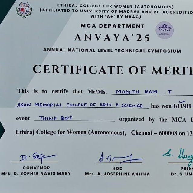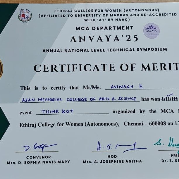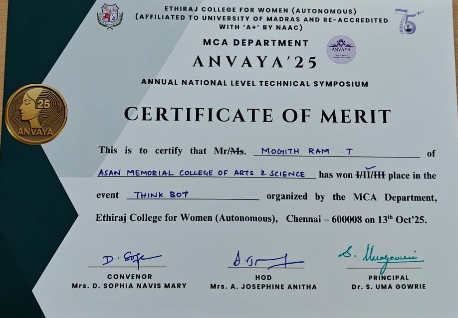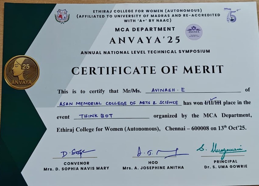 - 7 students from MCA Department participated in events CONNECT IQ, THINK BOT and BINGO in one day Annual Tech Symposium – ANVAYA ’25 at Ethiraj college for Women on 13th October 2025.